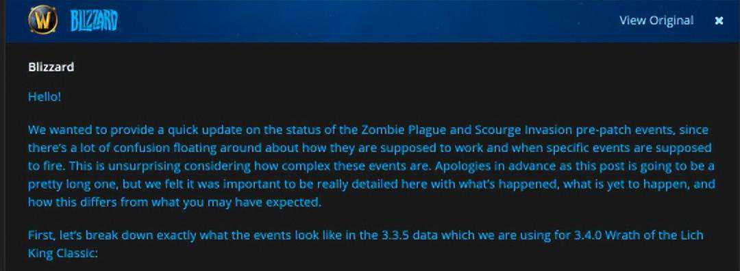 短文除了对僵尸瘟疫和天灾入侵补丁前事件的说明之外,还提到了在过去的魔兽世界怀旧服内容发布中,我们也遇到过类似的问题,比如TAQ开门世界事件,现在很明显,这些类型的老事件在现代环境中不太正常。