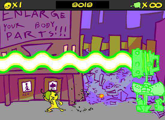 这是一款完成度相当高的横版射击游戏,玩家扮演一名黄色的外星人与地球上企图消灭它的FBI组织对抗。