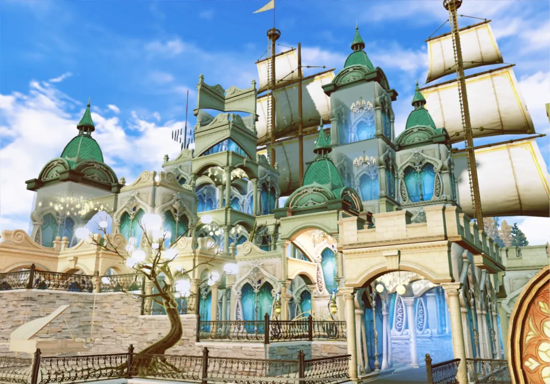 幽灵海岸:这座气势磅礴的海上舰团出自波子泡泡建筑师之手,想必是她心目中风暴庇护城的剪影,一艘随时将扬帆起航的船舶,停靠在神秘的尖顶欧式建筑旁。四处竖立着直挺的桅杆,悬挂起的风帆好似蓄势待发。蓝天是它永远的臂膀,在这座城中生活着的必定是英勇豪迈的幸存者。