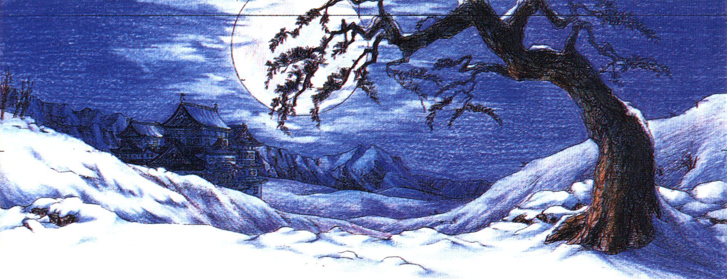 《少年街霸》在隆的背景中,仍然可以看到远处的朱雀城。大雪覆盖了整片大地,月光显得格外朦胧