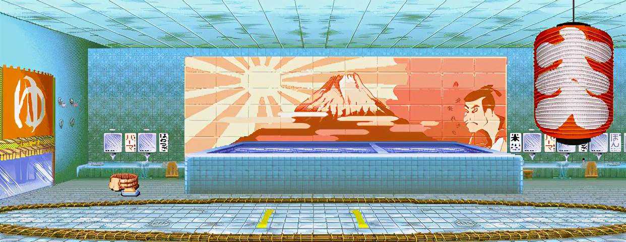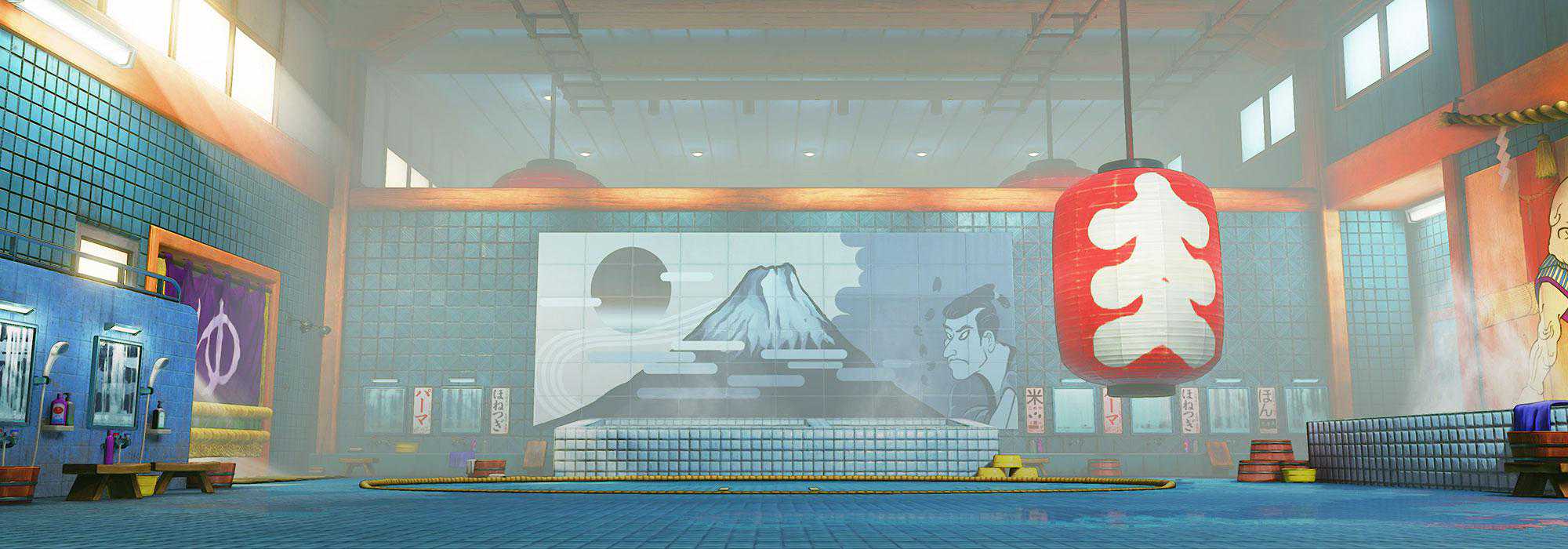 《街头霸王V》时期,这家店仍然存活着,而且加入了不少接近现代化的设施。看来浴场也能够与时俱进啊!以前《街头霸王2》打架的时候,很容易就到版边,那时候还以为这个场景很小。看到这个全景图才知道,原来这个浴场这么宽。别说单挑,群殴都可以的。