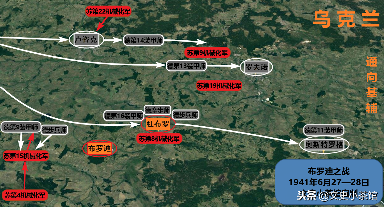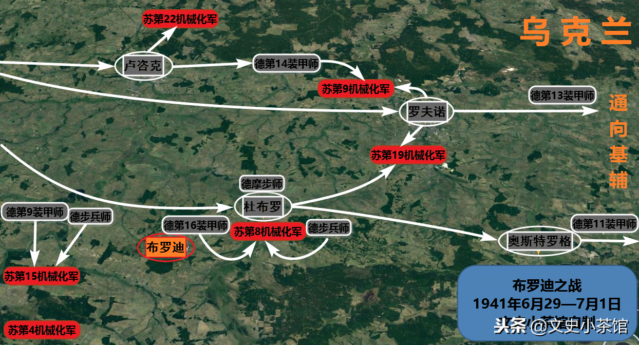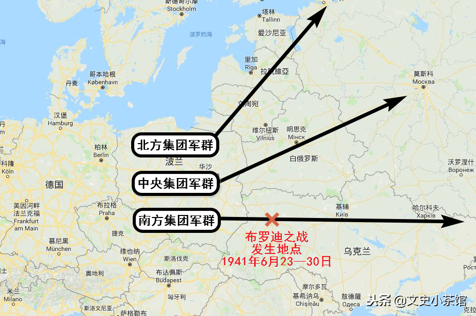 (笔者粗略勾画了一下巴巴罗萨计划德军进犯路线,红叉处即为布罗迪坦克战地点)