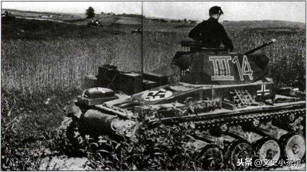 (德军第13装甲师的三号坦克50毫米炮中期型,一个带有十字架的小白色圆圈是该师师徽,路边还有两头乌克兰大白猪)