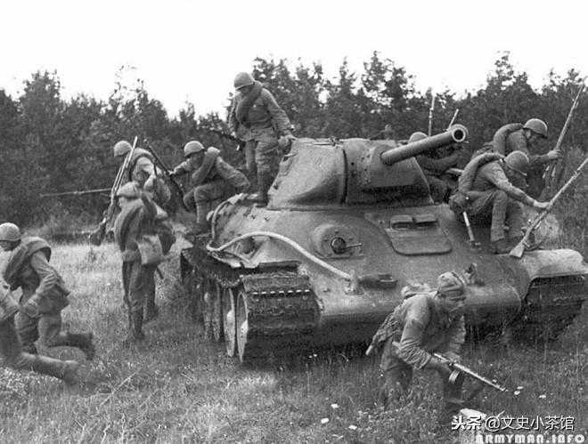 (T34中型坦克是划时代的经典设计,照片中搭载步兵正在下车,1941年)