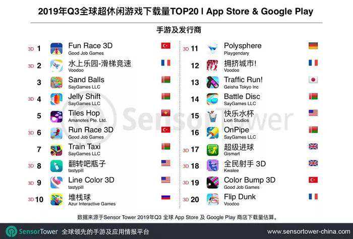 SensorTower数据显示,20款超休闲游戏中,来自土耳其发行商GoodJobGames《FunRace3D》在全球AppStore和GooglePlay共获得1.23亿次下载,位列下载榜榜首。法国发行商Voodoo《水上公园-滑梯竞速()》以8360万次下载量排名第2,白俄罗斯发行商SayGames《SandBalls》以6170万次下载位列第3名。