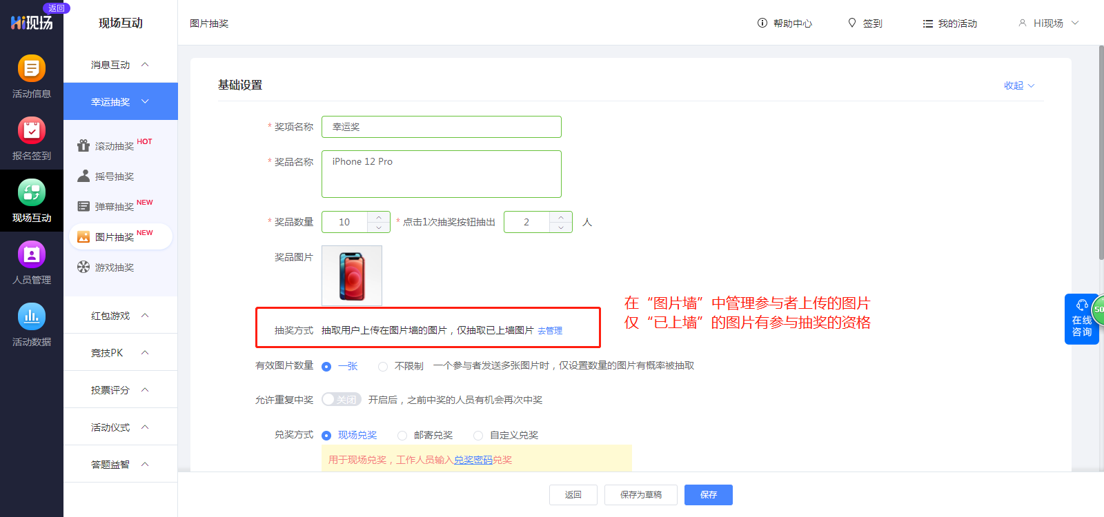 (一)进入互动功能设置,选择“图片抽奖”进行相关设置