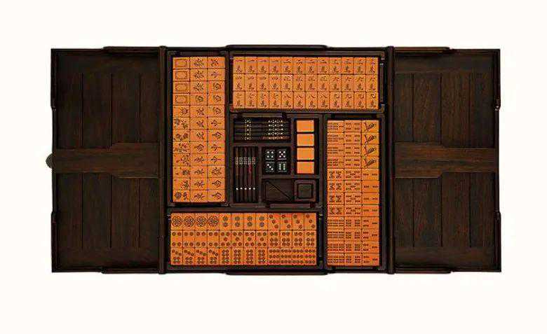 一款由奢侈品牌爱马仕Hermes旗下设计的麻将套装,该麻将套装采用深色红木为主的马达加斯加紫檀木为包装盒,并配有爱马仕标致性的小牛皮。Helios是标志着古希腊神话中太阳神的名字,盒子的外部线条呈现太阳的光芒,内部则是传统中式风水设计,并配有金色的骰子与风位牌。