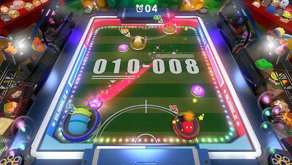 泡泡曲棍球套用的是桌面沙球的玩法,把球弹进对方的门就能得分,这里可以2人一组进行对抗,球的速度也比较快,稍有不慎就会自己乌龙。