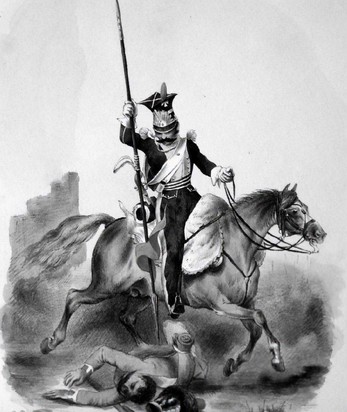虽然卢博米尔斯基声称能够从他家的庞大庄园里弄来一千个枪骑兵好手,但布耶等人最终还是得依靠原来隶属于波旁王朝法军的瑞士人、德意志雇佣兵乃至法军逃兵,才能勉强把全团兵力维持在三四百人,而且这些家伙虽然制服、装备、武器都像足了技艺娴熟的波兰枪骑兵,可连使用骑枪都得现学,如此空有其名的枪骑兵自然谈不上什么战绩,也不会给英军留下太好的印象,后来就干脆人尽其才物尽其用,被投放到疾病死亡率极高的加勒比海岛屿充当步兵使用,最终于1796年解散了事。至此之后,英军再度遭遇成建制的枪骑兵已经是整整15年之后的事情了,这一回,他们不幸在1811年5月16日的阿尔武埃拉战场,碰上了法军中经验最老道的波兰枪骑兵部队:维斯瓦河军团第1枪骑兵团(1erRégimentdelanciers,LégiondelaVistula),附带一提,这支部队隶属于法军而非当时的华沙大公国军队,当年年底正式改编为法军第7枪骑兵团。