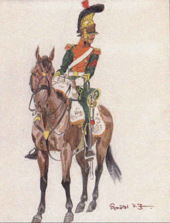 ▲图13.法军第2枪骑兵团上士,注意法国本土枪骑兵团仍然沿用龙骑兵头盔