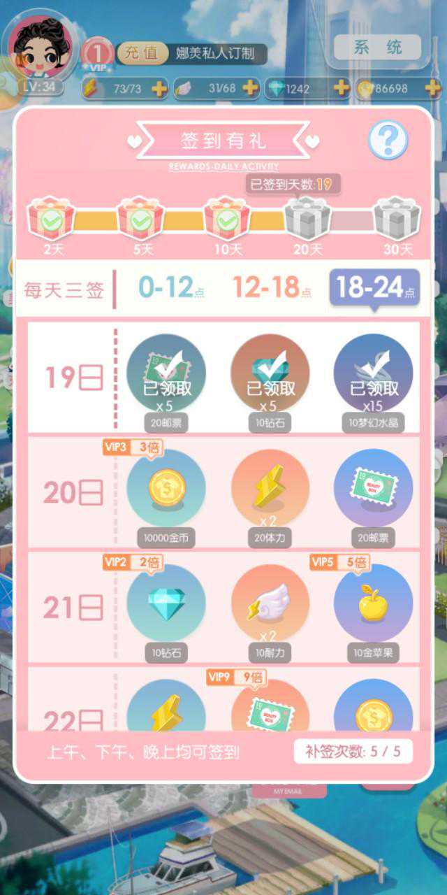 1.每日签到24小时三次签到奖励。可以获得钻石体力等等。这样更快去兑换我们喜欢的漂亮服装呢。