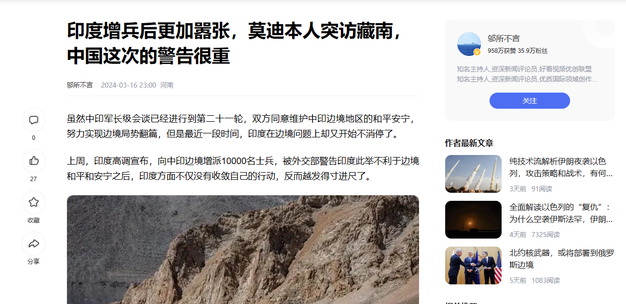 对于印方一直在边境问题上挑衅中方,这次的态度竞让人意想不到。