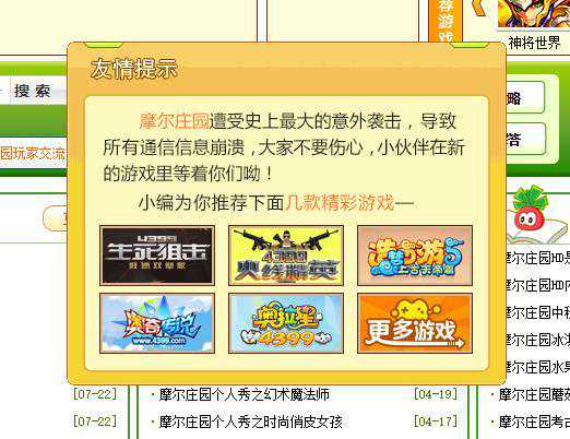 目前从4399游戏平台已经完全无法访问摩尔庄园游戏界面,访问摩尔庄园新闻、攻略等相关页面也都会弹出关于游戏下线的提示。