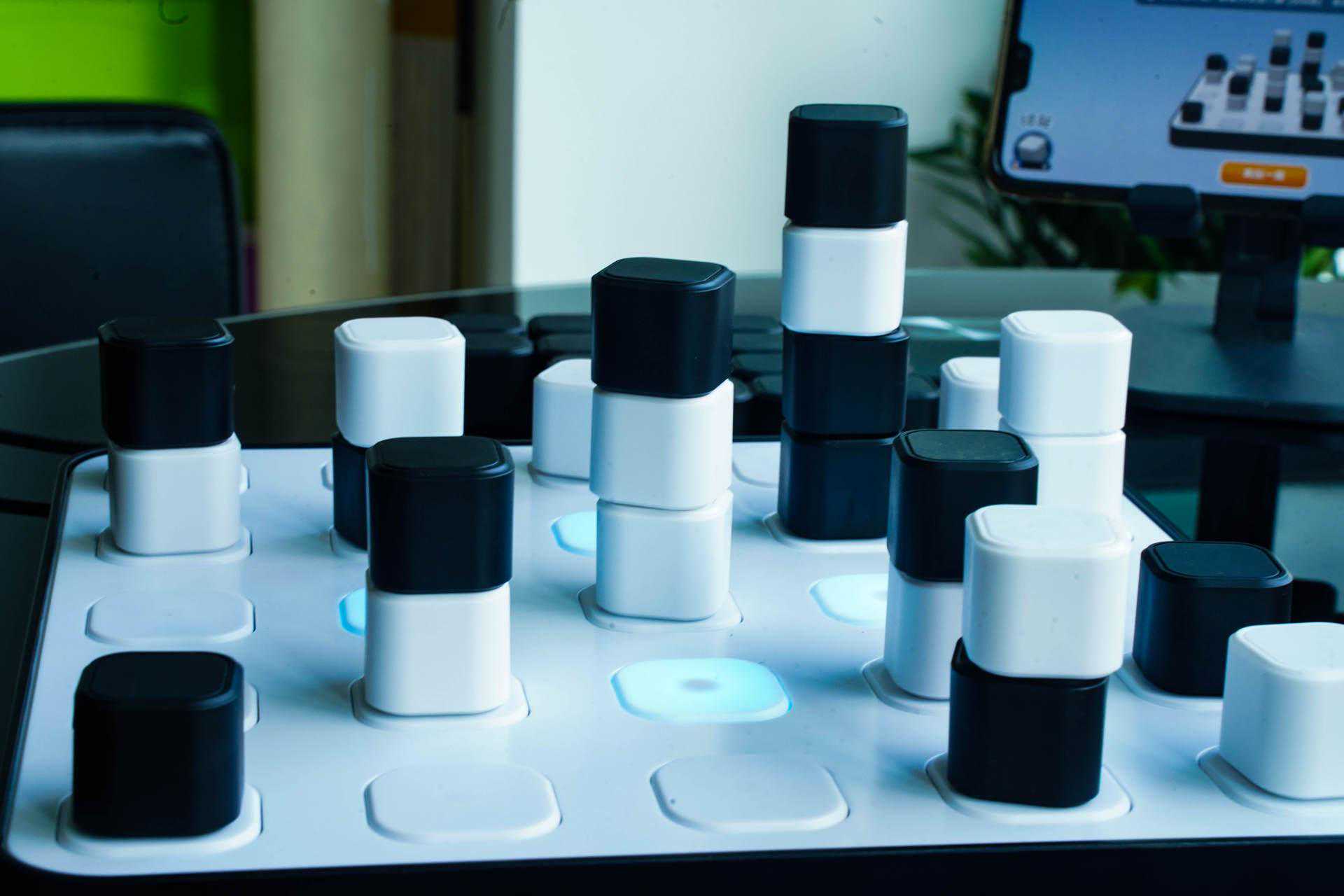 计客智能空间四子棋是5*5的空间棋盘,它能实现5*5*5三维立体的玩法,最高可以叠5层,这样也可锻炼空间思维。