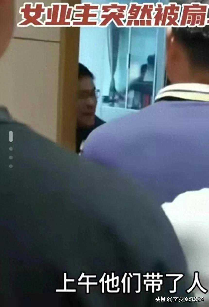 两人开始争论不休,气氛越来越紧张。男子建议去社区会议室讨论此事,但女业主对他拿着切片机的行为提出质疑。这时,男人激动得一巴掌打在了女主人的脸上!