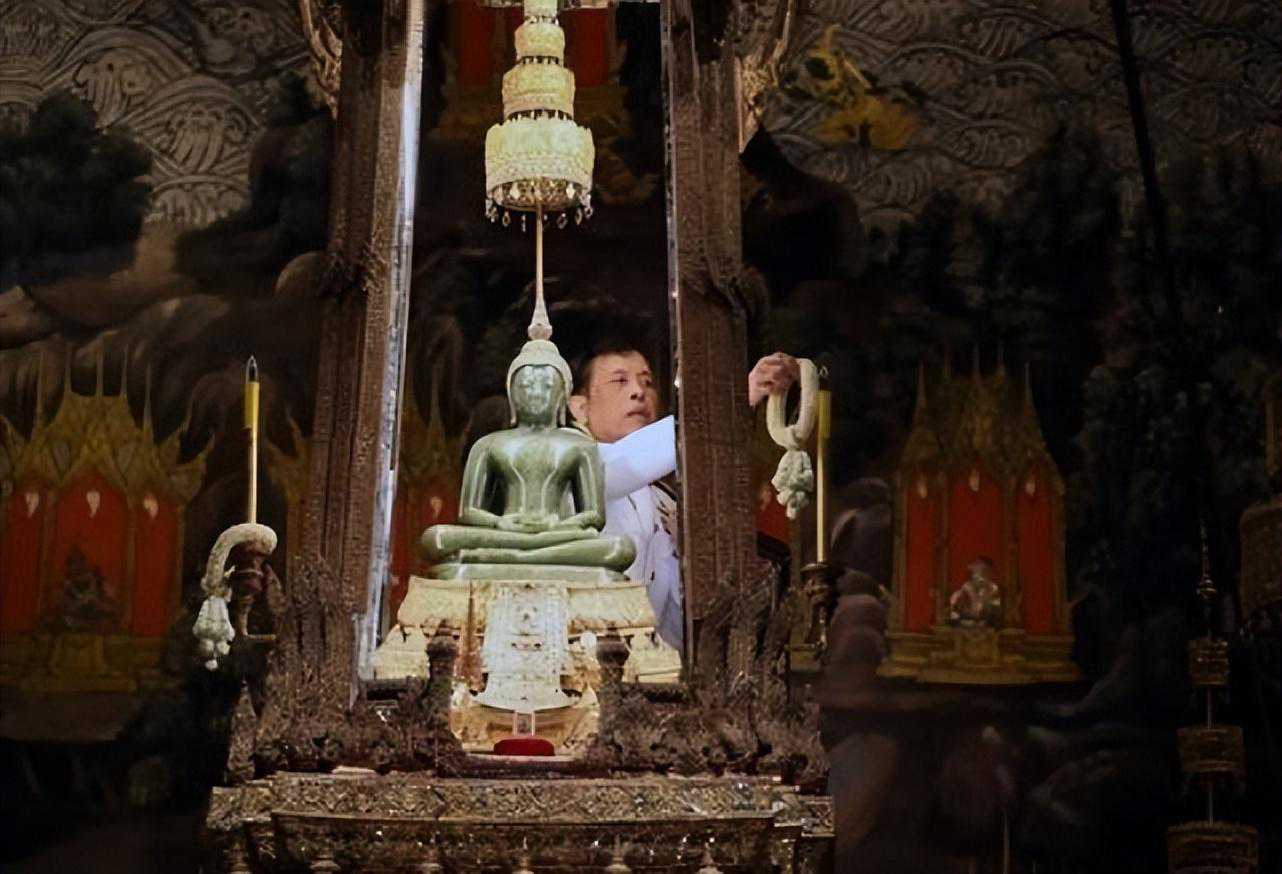现年70岁的泰王这次亮相的主要目的,是为玉佛寺中的国宝-翡翠玉佛像换衣服。