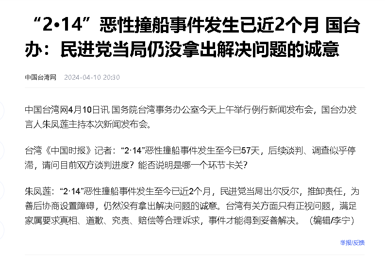 “2·14”恶性撞船事件发生已近2个月国台办:民进党当局仍没拿出解决问题的诚意