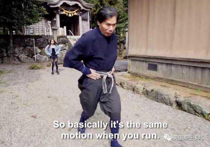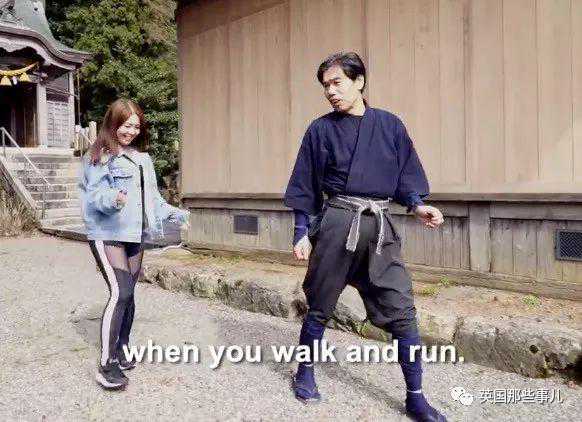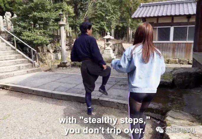 展示完了忍者的武器,川上大爷开始展示忍者特有步伐,在古代夜晚,地面上总是凹凸不平,为了不被绊倒,忍者需要用这种高抬腿的“鬼祟步”,才能一直保持安静和隐蔽.