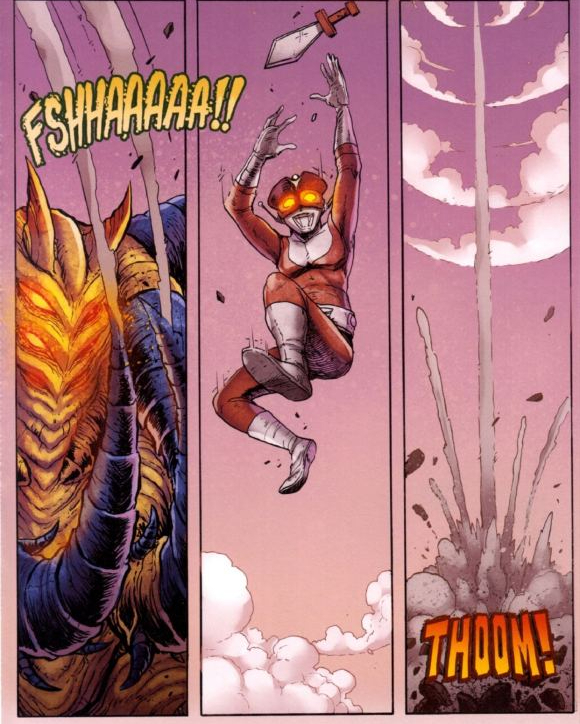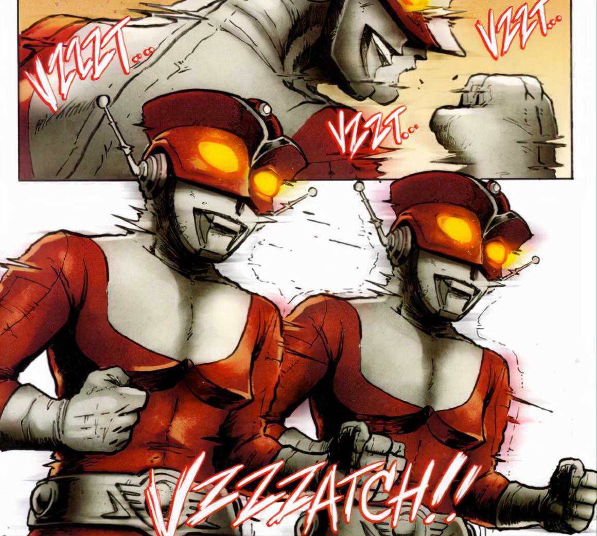在漫画中,还加入了很多有趣的圆谷元素。比如漫画中的正义怪兽,其形象就是最初奥特曼的设计稿鸟人“百慕拉”。又比如,漫画中还致敬了奥特曼系列的经典剪影片头等。
