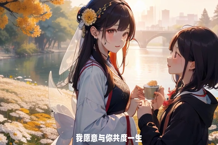 有一天,当文秀再次来到菊花丛时,他遇见了一个美丽的姑娘。她身着绿裙,头戴菊花,肤如凝脂,眼似秋水。这位姑娘自称是菊花仙子。她说:文秀,你的才华和真诚打动了我,我愿意与你共度一生。文秀惊喜交加,与菊花仙子结为知己。