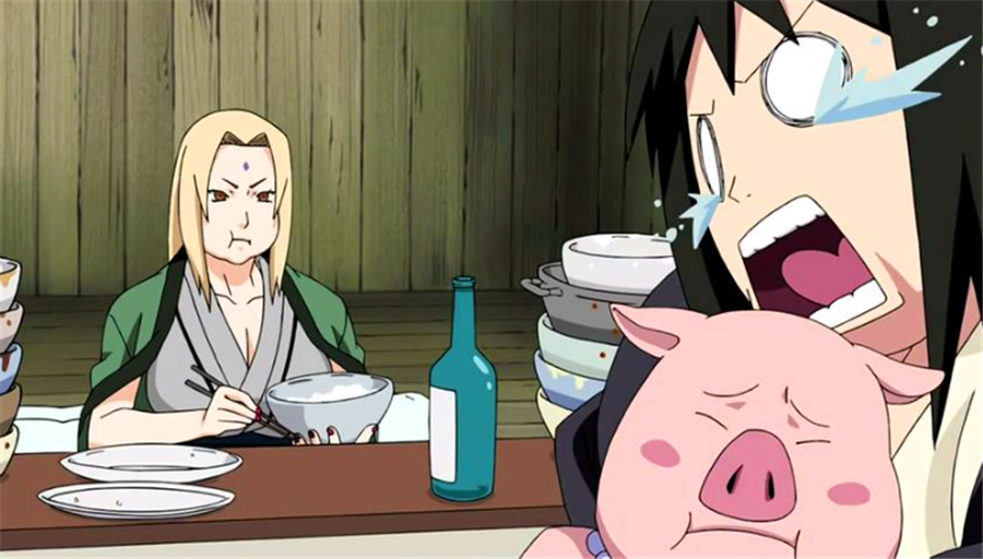 纲手虽然一直没有表现过自己的食量,但是在佩恩入侵木叶中昏迷的纲手,在醒来后的第一件事,就是大吃特吃。其惊人的饭量,直接震惊了静音。所有的食物都被吃完之后,纲手没有一点吃撑的样子,让静音差点以为她想要把豚豚也吃掉。