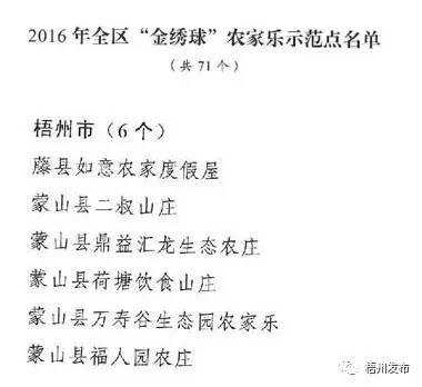 近日,阿布从自治区旅发委了解到,广西区内有71家农家乐被列入2016年全区“金绣球”农家乐示范点。其中,梧州有6家农家乐上榜。