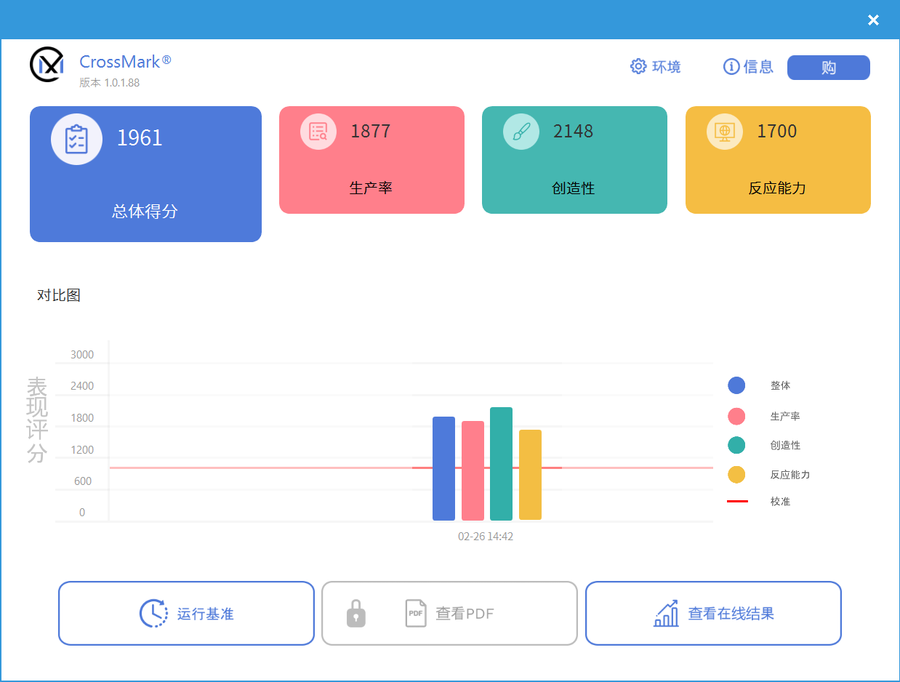 在CrossMark测试中,幻16经典版的成绩为1961分,CrossMark也是一款比较常用的生产力测试软件,根据生产率、创造性以及反应能力三方面的表现给出综合的评分。