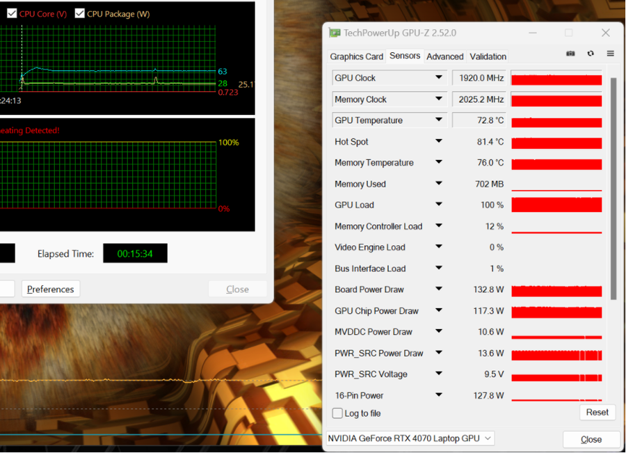 双烤15分钟,CPU的功率为25W,温度为63℃;GPU的功率为132W,温度为72.8℃,总功耗为157W,对于一款主打生产力的全能本而言,这样的成绩是相当出色的。