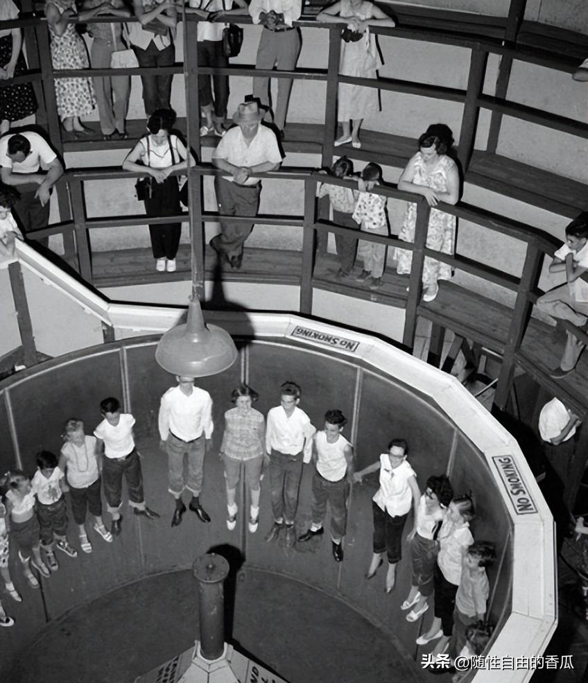 24上世纪50年代,美国游乐园里的旋转游乐设施。早期的设施和现代的区别很大,当时设施上没有座椅,人们进去之后靠墙站,随着设施的旋转速度越来越快,在向心力的作用下,人们会被“按”在墙上,脚下的地板下降后,看起来就像是悬在空中一样。