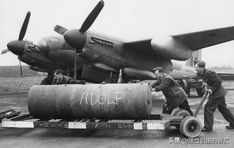 261944年,在英国的一处机场,皇家空军的两位地勤人员,正准备将推车上的炸弹,运送到轰炸机旁。这一枚炸弹的重量高达4000斤,威力巨大。在炸弹上还有他们写的字:“圣诞快乐,阿道夫”。这就是他们送给敌人最好的礼物。