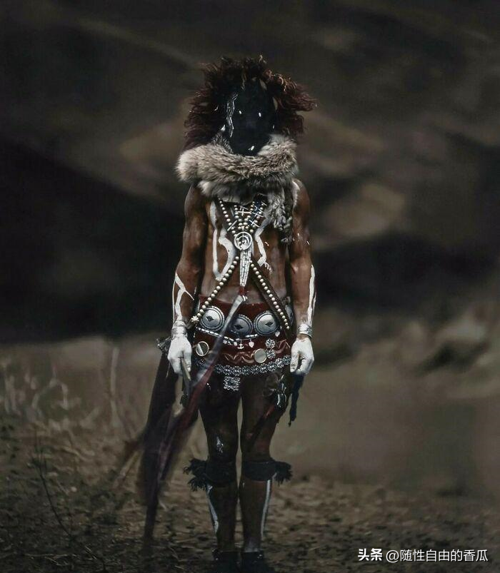 291904年拍摄的一个纳瓦霍人,他正穿着他们部落神话中的传奇服饰。