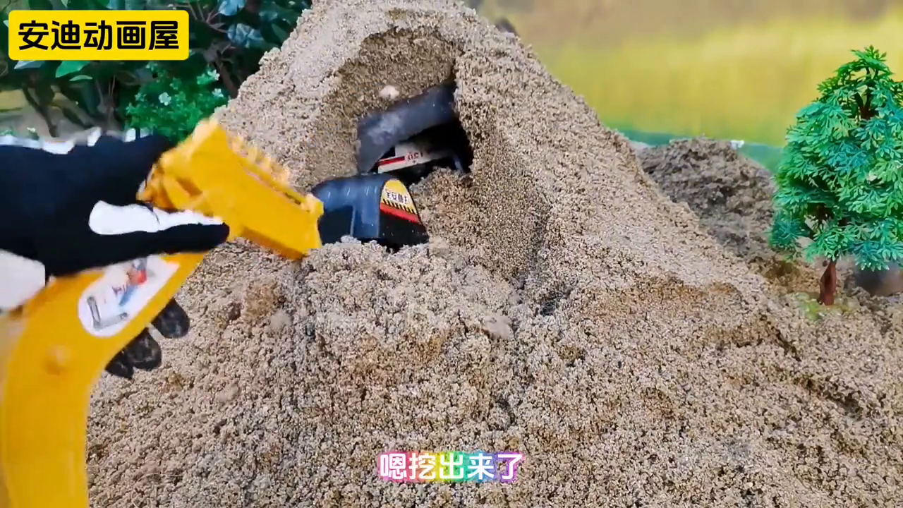 小朋友快看,这个沙堆里边拥有宝藏,让我们一起来把它挖出来。看来我们需要找一些工具。这是挖掘机的挖斗,让我们用挖斗来挖出藏在沙堆里的宝藏。这个是小挖斗,它太小了,挖的太慢了,扔掉。让我们来看一看这个大挖斗。这个挖斗这么大,它挖起来一定非常快,就用它了。开始,挖出来了。这是什么?快点让我们来看一下,好像是一辆救护车,快点把它救出来。它被卡住了。