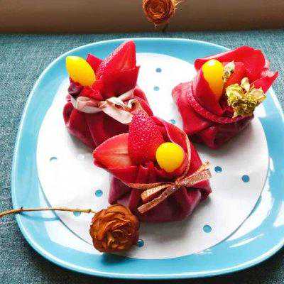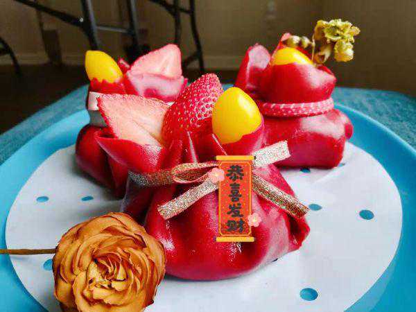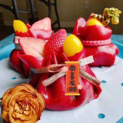 今天嘻子为大家带来的是很是受欢迎的福袋蛋糕,小小的福袋蛋糕包裹着你的浓浓情意,又喜庆漂亮还好吃。其实外层的福袋就是红丝绒千层皮,里面则是戚风蛋糕片,夹馅可以是你喜欢的任意味道。我做的是摩卡奶酪配草莓果酱和果粒。当你切开蛋糕,用小勺子挖下一口送进嘴里,摩卡奶酪带着咖啡香味和奶香率先袭击了你的味蕾,接着是草莓水果和果酱的清甜,千万不要以为咖啡和水果不搭对哦。品尝一下你就会打开未知美味的大门~当然你也可以为了省事只夹打发奶油,不过嘻子觉得由于千层皮和戚风蛋糕并不甜,所以夹馅的调味就是整个蛋糕的基础味道,这个味道丰富一点,蛋糕自然就多添一丝好吃啦(。・∀・)ノ゙话不多说,要知道好不好吃,赶快来试做吧!配料如下。此配方可做5-6个小福袋蛋糕。千层皮直径在22厘米左右。
