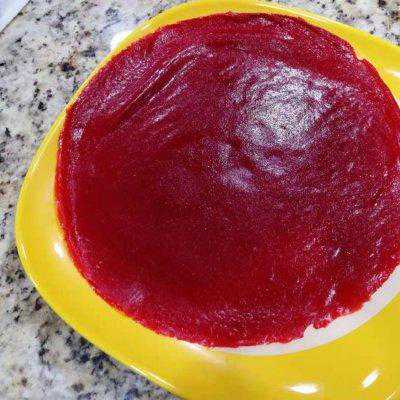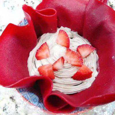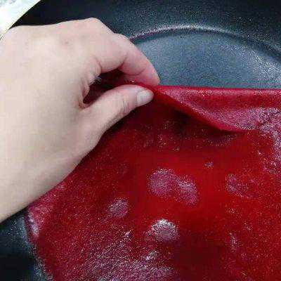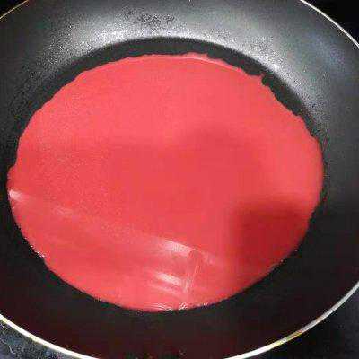10、开中火将平底锅加热片刻,转小火。在平底锅中舀入一勺红丝绒面粉液,转动平底锅使面粉液均匀地在锅内铺开成圆形。⭐平底锅要大些,直径要超过20厘米(8寸),以二十五六厘米最佳。⭐面皮不要太厚,也不用追求千层蛋糕的薄度。太薄或太厚在包裹蛋糕片时都容易破。个人觉得0.5毫米-1毫米之间最佳。