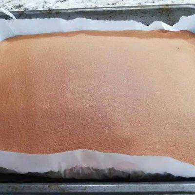 29、烤好的蛋糕胚从烤箱拿出来磕3下,震出热气,倒扣在晾凉架上。