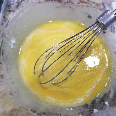 7、黄油融化成液体,稍稍放凉后,分两次加入面液,每一次都要搅拌均匀。
