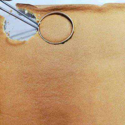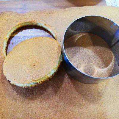 40、将千层皮不规则的外缘切割整齐。我是用8寸慕斯圈直接切割的。