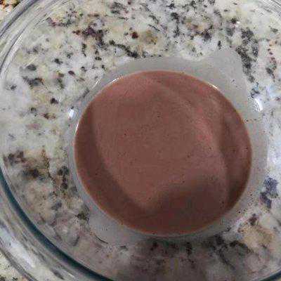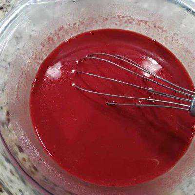 9、加入适量的红丝绒液。最后再过一边筛。放入冰箱冷藏半小时待用。牌子不同,呈现颜色都会有所不同,我滴了8滴,呈现下图的颜色。