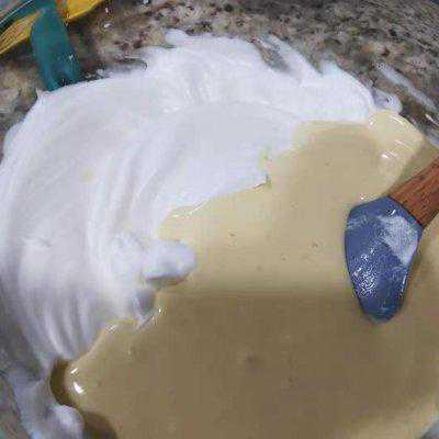 23、先舀1/3蛋白和蛋黄糊用硅胶铲翻拌混合。