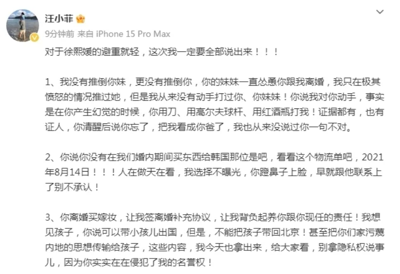 在这篇长文中,汪小菲首次公开回应了大S提出的关于离婚买嫁妆和补充协议的问题。