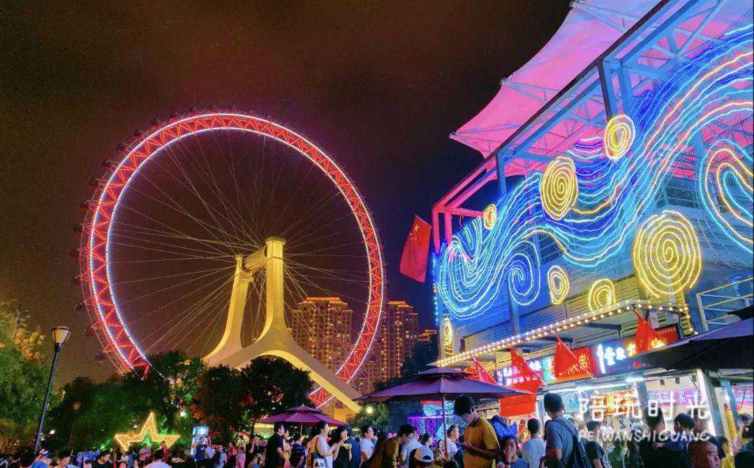 这里除了坐摩天轮,在这里还可以乘坐游船欣赏海河夜色,还有让人垂涎欲滴的摩天轮夜市。
