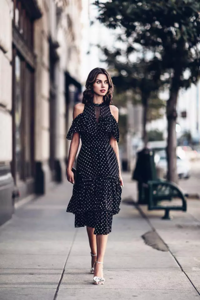 波点连衣裙是日常见到最多的单品,不管什么款式的连衣裙,只要有了波点元素的加入,就会增添一丝清新和活泼。比如今年大热的茶歇裙就经常和波点元素组合在一起,不仅有着浓浓的复古风情,还在一定程度上起着修饰我们身形的作用哦。选择波点连衣裙时,尽量适当露肤,才不会显得沉闷,如果是黑底白点的连衣裙,小编建议选择下摆开衩的款式,加入性感的元素可以中和掉颜色带来的老气感。如果你觉得连衣裙面积过大,或者同一种色彩过于单调,一条颜色鲜丽的长丝巾做配饰就能告别无聊。