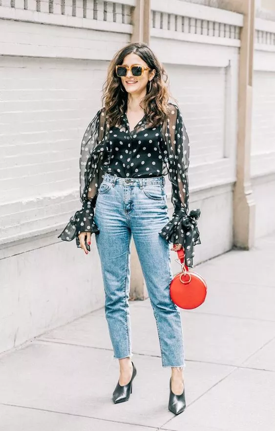 衬衫作为百搭、干练的上身单品,碰上波点元素以后,最容易营造出复古的感觉了,无论是日常穿搭,还是出席正式场合都是非常合适的。波点衬衫自带法式风情,搭配时,选择一些比较drama的大耳饰佩戴会更惹眼。想要摆脱严肃感,可以选择V领款或者稍微解开几颗纽扣更显气质。而一些有设计感的波点上衣非常吸睛,担心太过甜腻,可以下半身搭配硬朗的裤装打造娘ma平衡的风格。注意由于波点元素已经够花,搭配的时候尽量遵循繁简结合,整体才不会显得太繁杂。