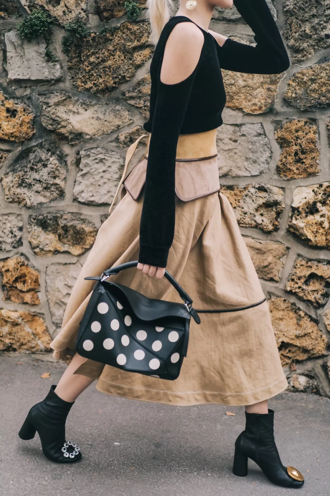 除了大面积穿着,波点元素还可以作为配饰点缀,起到画龙点睛的效果。波点鞋算是非常有特点的鞋类单品,而有着细小鞋跟的波点猫跟鞋也很好拗造型,上身就算全是基础款,有了波点猫跟鞋的加磅瞬间就变得洋气了许多。波点元素应用到包包上更是好看,活泼、优雅、性感、可爱一个包包全都搞定!当然啦,如果你没有波点包包,还可以在背带上系一条波点的丝巾,不仅更加时髦好看,还可以起到一包多用的效果哦。