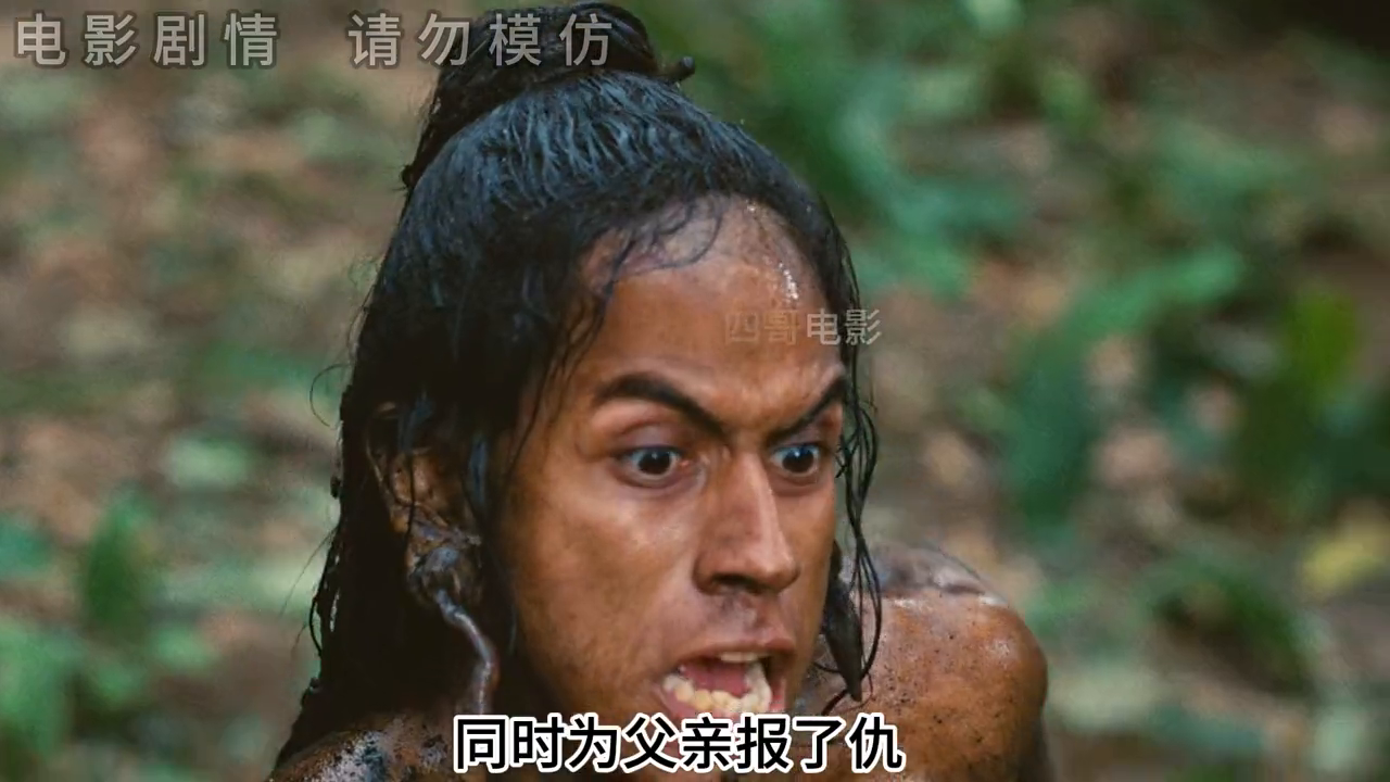 看到丧彪等人路过身边往前追去时,小伙卷起一张芭蕉叶做成吹管,对准后面落单的小弟吹了出去,很快毒性就起了作用。然而小弟的叫声正好被不远处的同伴听到,看着折返回来的这张脸,小伙想起了被杀害的父亲,再也压不住心中的仇恨,冲了上去,巧妙地躲开攻击,同时为父亲报了仇。