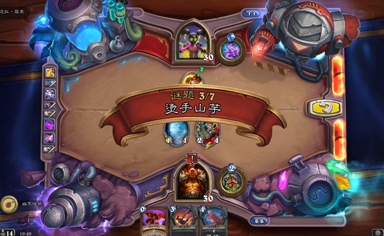 第三关:烫手山芋。这一关的要点在于那只特殊的随从,在哪边死亡,英雄就会直接挂掉。起手小精灵A一下,然后装备死亡旋风,全场打1,同时给狂战士上一份怒火中烧A爆炸弹,获胜。