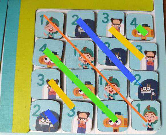 4阶幼儿数独:按对角线,同个数字放在同种颜色的对角线上