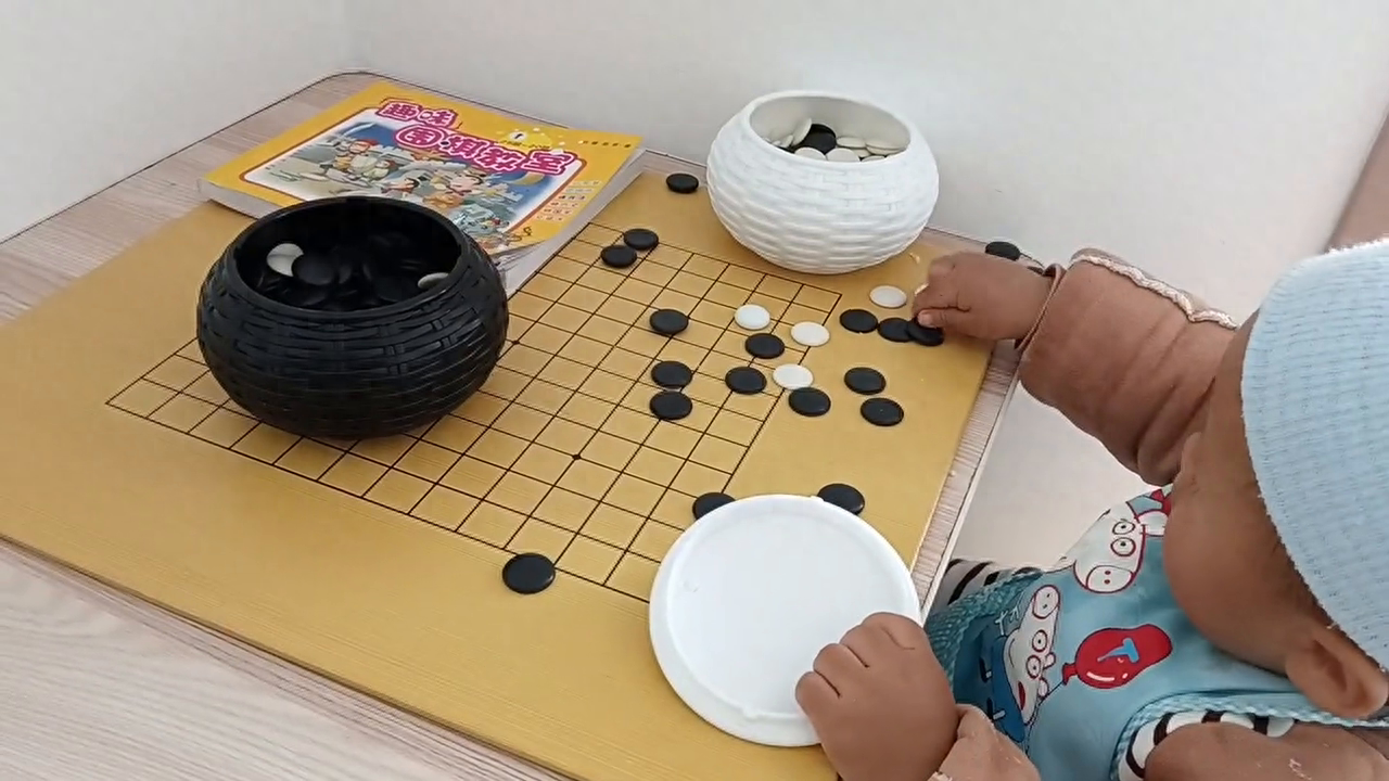 早上好,我们棋棋小朋友今天早上已经起床了,现在喝了奶以后他就坐在自己的棋桌上开始玩他的围棋了。他的围棋时间到了,琪琪小朋友现在已经有一岁3个月,现在是想让他感受一下围棋棋感。