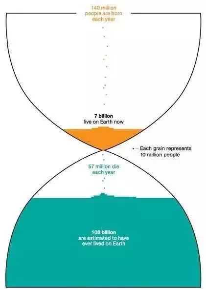 上图每一个点就是1000万人,每年有大约1.4亿人诞生,大约5700万人死去,估计曾有1080亿人在地球活过并死去。