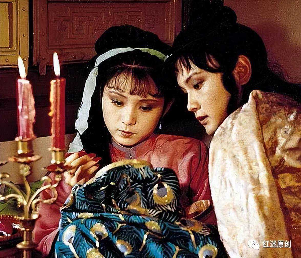 当下麝月秋纹已带了两个丫头来等候,见宝玉辞了贾母出来,秋纹便将笔墨拿起来,一同随宝玉进园来。宝玉满口里说“好热”,一壁走,一壁便摘冠解带,将外面的大衣服都脱下来麝月拿着,只穿着一件松花绫子夹袄,袄内露出血点般大红裤子来。秋纹见这条红裤是晴雯手内针线,因叹道:“这条裤子以后收了罢,真是物件在人去了。”麝月忙也笑道:“这是晴雯的针线。”又叹道:“真真物在人亡了!”秋纹将麝月拉了一把,笑道:“这裤子配着松花色袄儿,石青靴子,越显出这靛青的头,雪白的脸来了。”宝玉在前只装听不见,又走了两步,便止步道:“我要走一走,这怎么好?”麝月道:“大白日里,还怕什么?还怕丢了你不成!”因命两个小丫头跟着,“我们送了这些东西去再来。”宝玉道:“好姐姐,等一等我再去。”麝月道:“我们去了就来。两个人手里都有东西,倒像摆执事的,一个捧着文房四宝,一个捧着冠袍带履,成个什么样子。”宝玉听见,正中心怀,便让他两个去了。